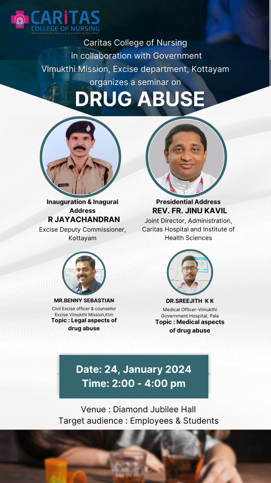 Caritas College of Nursing in collaboration with Government Vimukthi Mission, Excise Department, Kottayam organizes a seminar on DRUG ABUSE. Target Audience: Employees & Students.